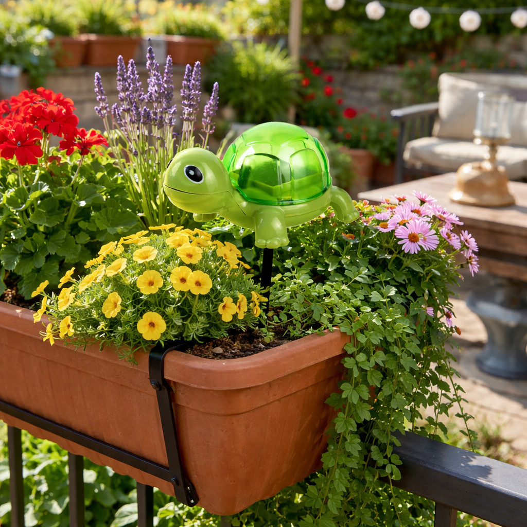 Természetes megjelenés: Az élénkzöld szín és a teknősbéka forma remekül mutat a fűben vagy a bokrok tövében.