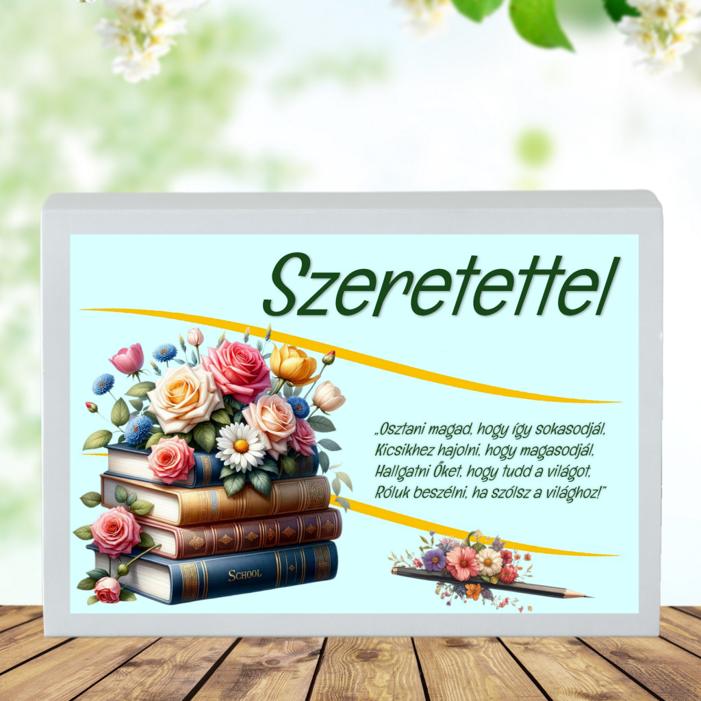 Lepd meg az év végén szeretett tanárodat, óvónénit vagy osztályfőnöködet egy igazán különleges és szívhez szóló ajándékkal! Ez a gondosan összeállított, feliratos ajándékdoboz nemcsak esztétikus, hanem környezettudatos meglepetés is, amely hosszú távon örömet szerez.